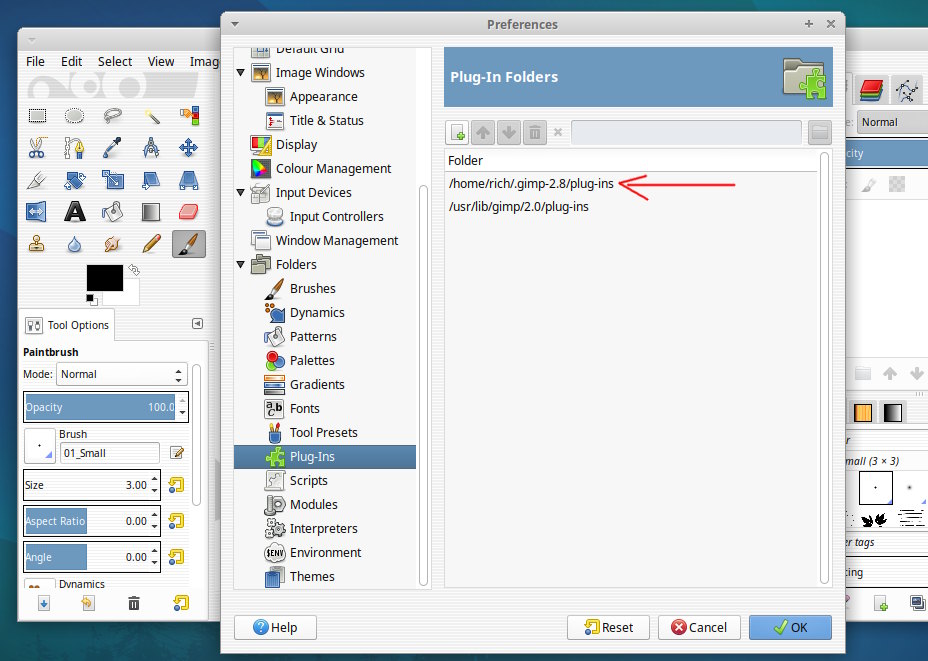 Linux folders, as far as Gimp is concerned, open Gimp. Go to Edit -> Preferences then expand the folders section. All the paths to your resource folders are shown there. This the plug-ins in my Acer netbook.