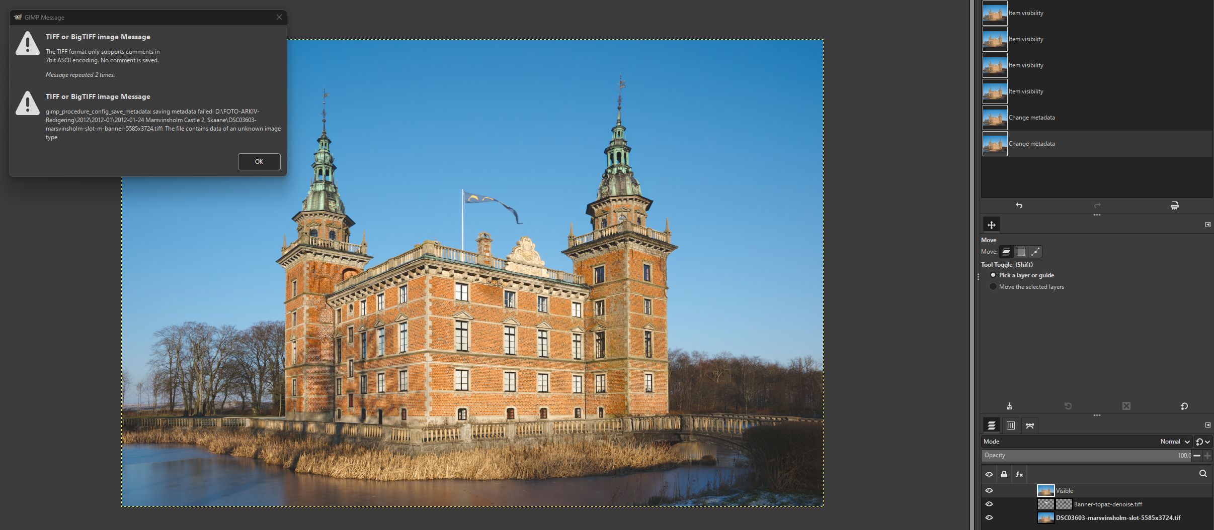5. Then an export as a TIFF was attempted - with all layers, and all exif data including the description. .... But that brings up the error shown - can't export the description, which apparently has a wrong format.