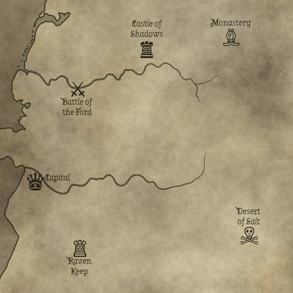 1. In this map I have used font Almendra Display for the text, all in it's own group. The font itself renders almost transparent in Gimp (reported bug, affecting all small/fine fonts: Bernard Mode, Architect..) so  *I did a group_text2path, and stroked the result at line 1px in a new transparent layer*. Voilá!