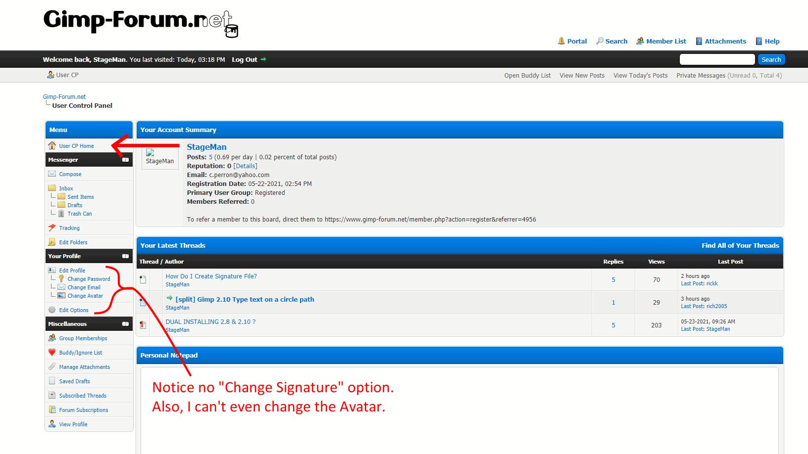 edit: Pop a post in here https://www.gimp-forum.net/Thread-Avatar-not-working and he should see it.