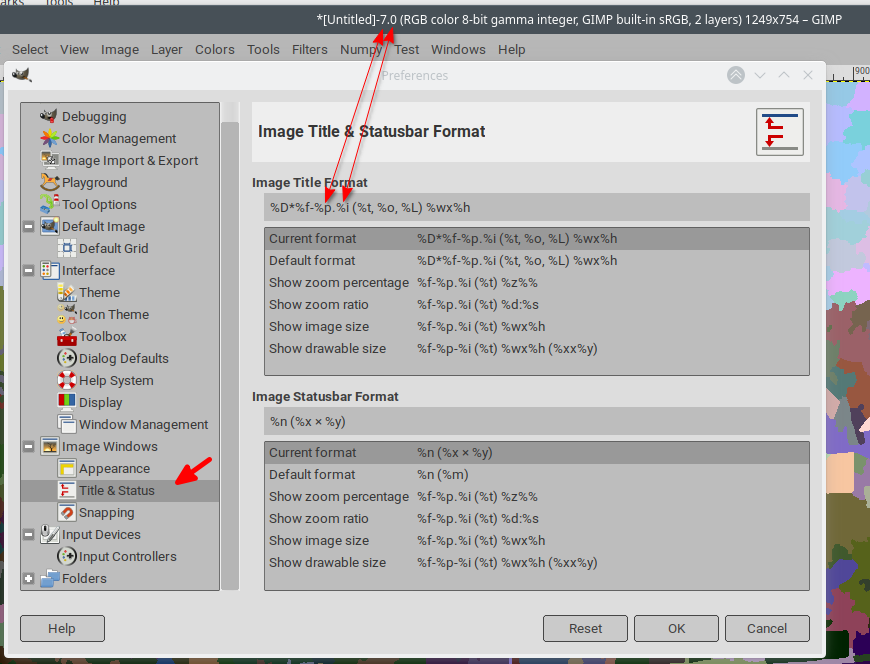 However, if you want a different display in the titlebar, you can cheat... The title bar contents are created from a "format string" where items identified with a %X notation are replaced by data from the image: In this image 7.0 means it's the 8th image, 1st view (because you can create several views per image). But you can replace %p.%i by a fixed value (after all the "." between them is a fixed value, as ar some other punctuation characters) so for instance "0.0": If you try you'll see that the image title bar is updated as you type, so if this is for a one-shot screenshot, you don't even need to set the preferences.