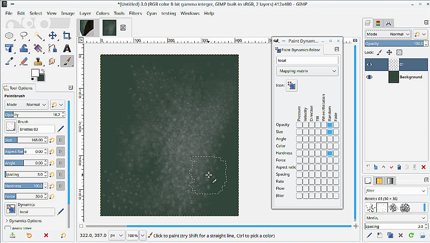 As a pure guess, is it that 'dappled' pattern over the dark back ground ? It might be something like this in Gimp. 1. The stock bristles brush with a dynamic and very much reduced opacity. 2. A My-Paint brush coarse-bulk 2 with reduced opacity / hardness.. pays to experiment.