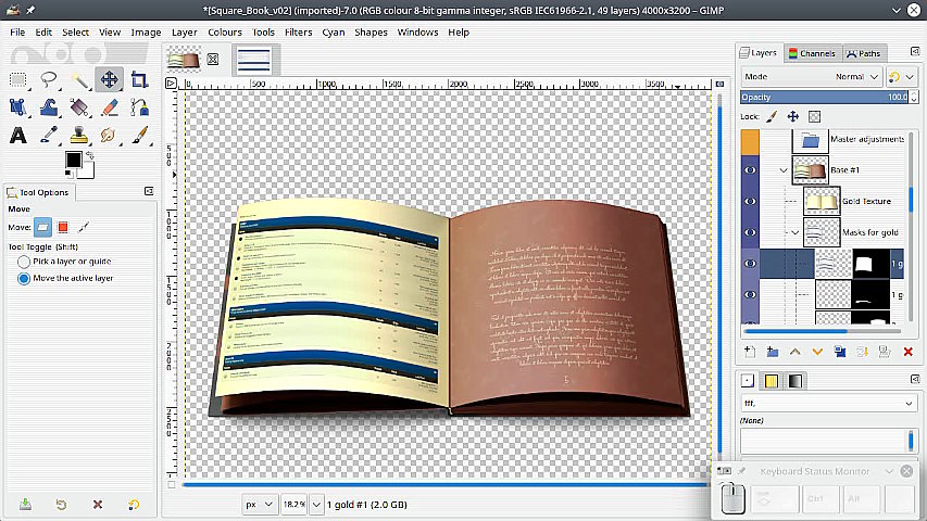 I'm trying to create a book mockup. The mockup template is a PSD file which opens fine in Gimp. The cover image needs to be pasted into a layer with a mask.