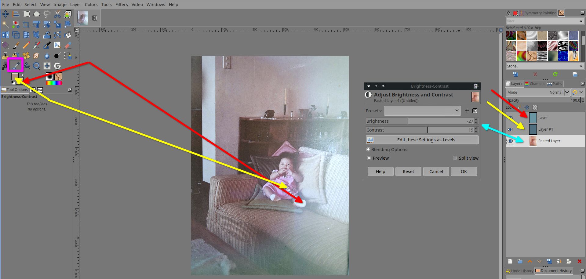 - - You can do on the bottom layer Colors ➤ Brightness-Contrast on it or even better ➤ right click on the top layer in the layer stack and select ➤ New from visiblethen Colors ➤ Brightness-Contrast on it.