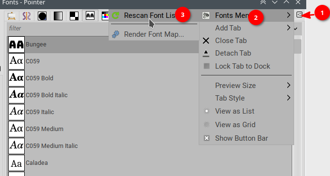 In the Fonts list, hit the |<| icon on the right of the tab line, then Fonts menu ➤ Rescan fonts list.