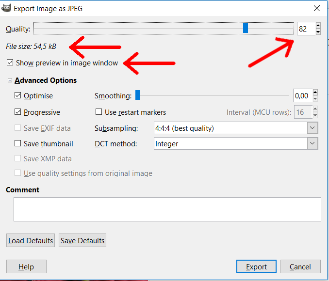 (04-22-2018, 07:22 PM)Ofnuts Wrote: In the JPEG Advanced options, change the "Subsampling" to 4:2:0 (chroma quartered): this is the biggest size reduction with the smallest visual impact. Then reduce quality until your file size is small enough. There is a "Save for web" plugin that gives you the estimated file size while you change the parameters and makes this a bit easier.Thank you. Where can I find the "JPEG Advanced Options? (04-22-2018, 07:05 PM)Blighty Wrote: Besides the file size requirement (100kb),Thank you. How do I find the screen you show in your post?