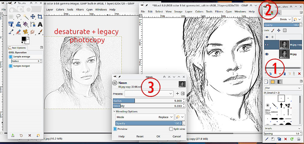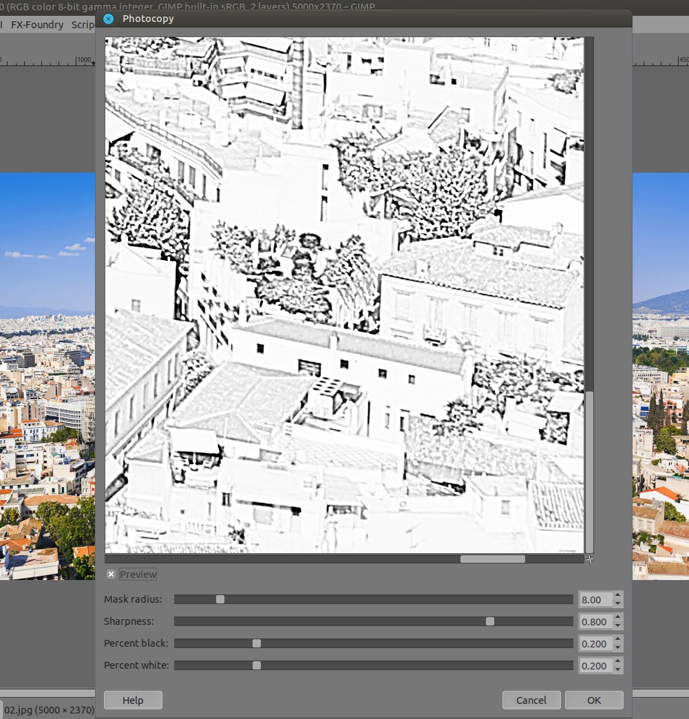 When I desaturate the photo I then proceed to go to Filters/Artistic/Photocopy (legacy) then voila a small preview