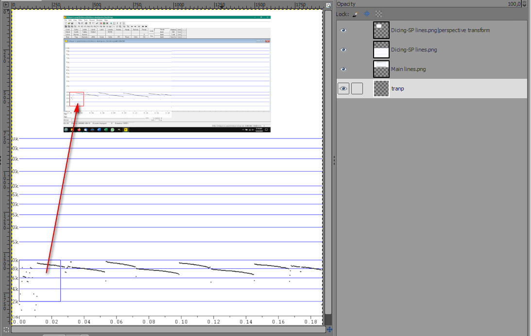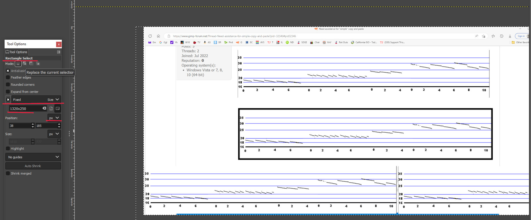 I have a "master" image that will be used as a background and 4 separate images cropped from the same scale (size) image I need to combine these by pasting and aligning them into one image.  Followed by 2 others I need to crop and paste into the main image to show comparisons of the Y scale (blue lines). Every time I copy the cropped images and try pasting them onto the main image the size is changed on the cropped image and no longer correctly aligns with the main image.  This is a task I need to master,  as I need to repeat it hundreds of times.  Any suggestions are welcomed. Two examples are below.