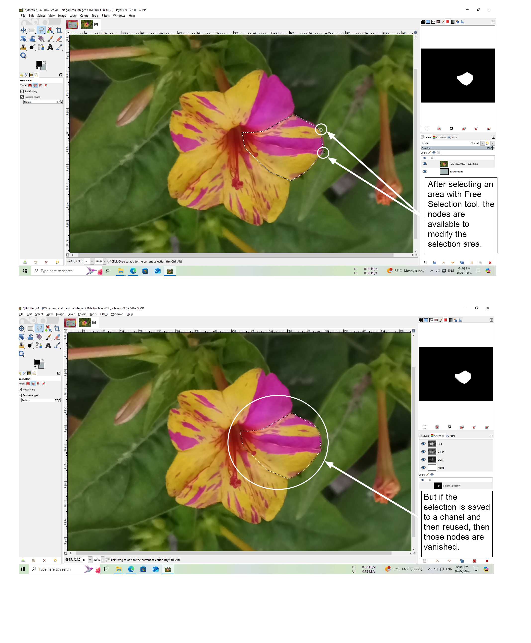 But if I save the selection in a chanel, then all nodes become vanished when I reuse the selection from saved chanel. So that it cannot be possible anymore to modify the selection area by dragging nodes.