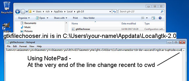 1. gtkfilechooser.ini is in C:\Users\your-name\Appdata\Local\gtk-2.0