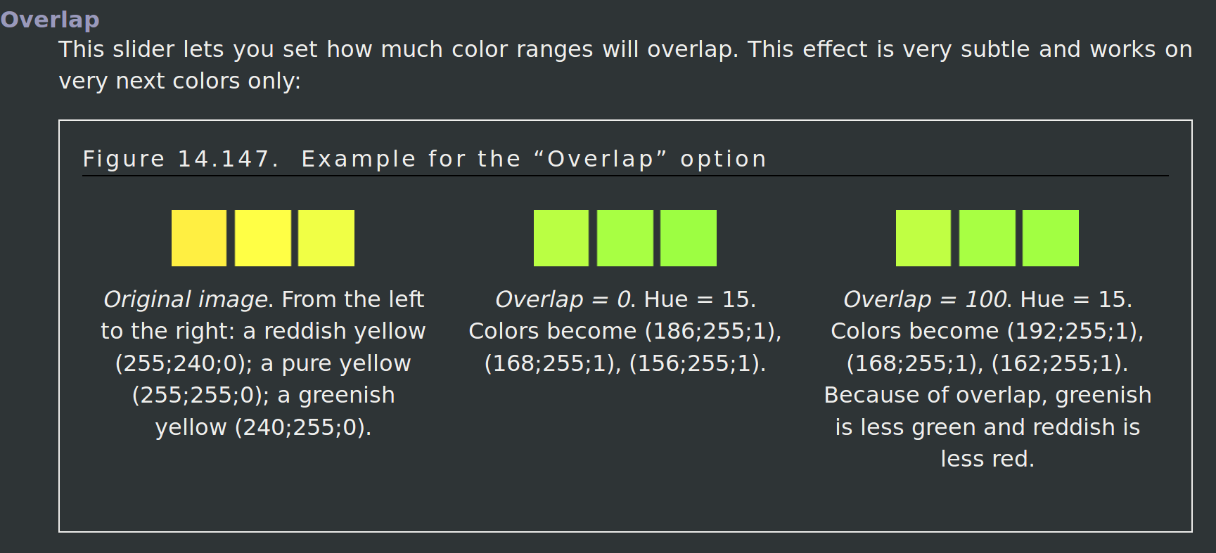 I'm reading gimp Docs. I attached the part of doc for the overlap in Hue-Saturation where how they explain about it. It was difficult to understand what they mean only by reading it. So I tested overlap for myself. I kindof get the concept of it. However I feel like something missing cause I don't understand what docs say about it. Would you tell me how to get the correct concept of overlap in Hue-Saturation dialog?