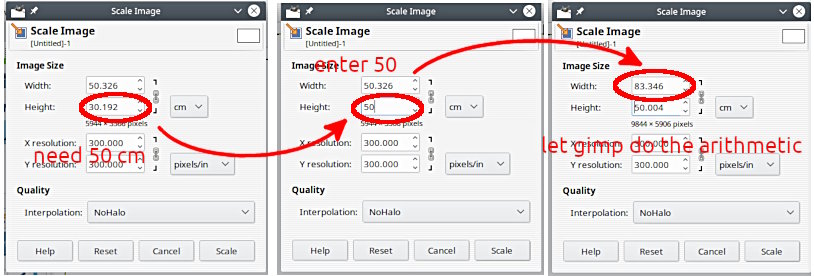 For scaling even using cm as units I advise letting Gimp do the arithmetic. With the width and height linked together
