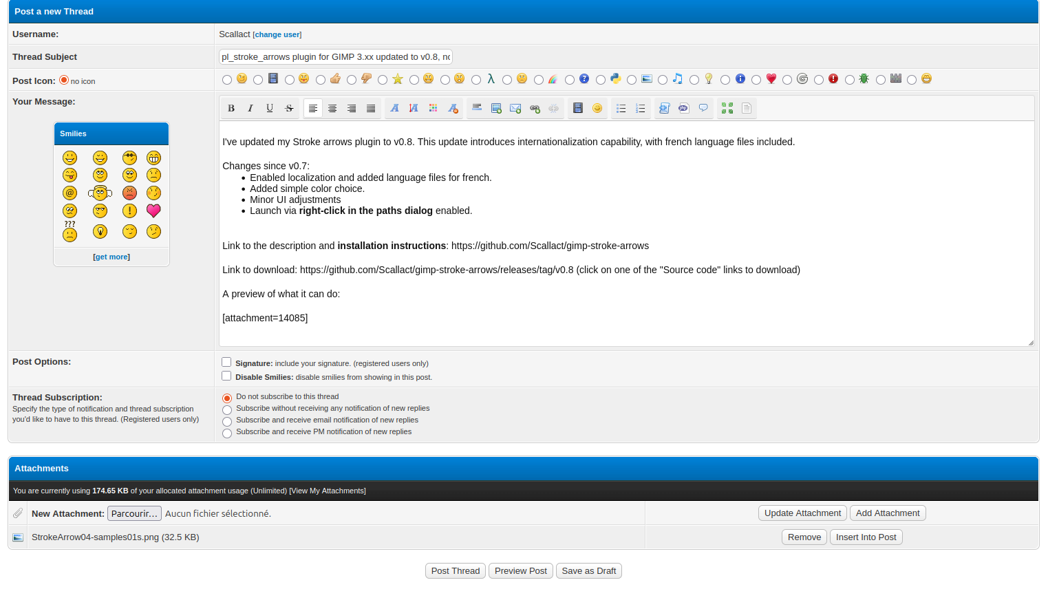 I tried to post a new thread for my updated pl_stroke_arrows plugin, and was granted the "Your are in violation with the forum's rules" message, with a link to said rules.