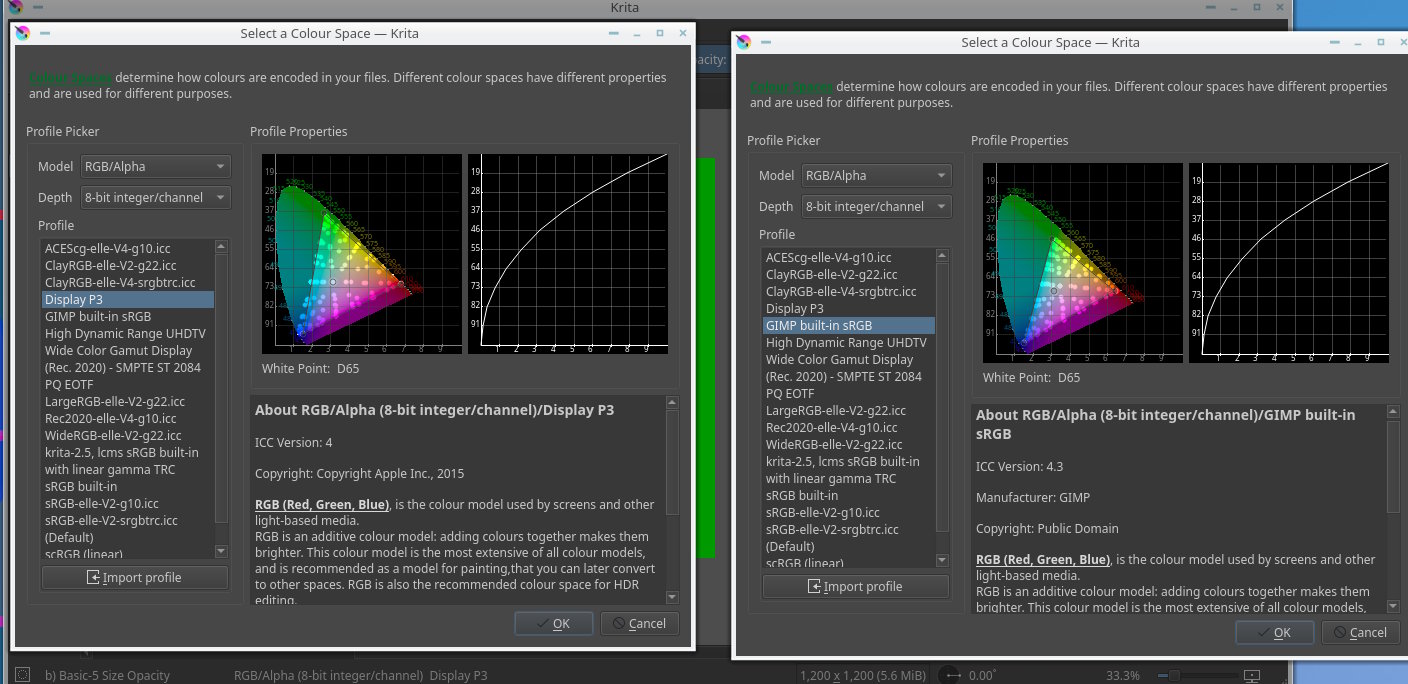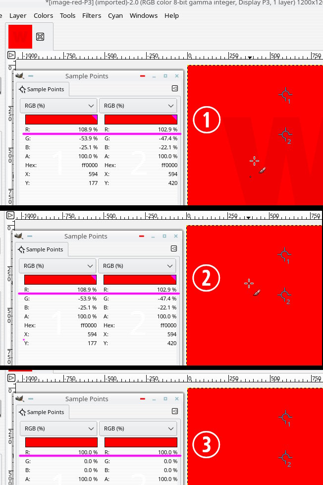 Does anybody know what's going on with those values? Correct me if I'm wrong but I think assigning an .icc profile to the image does not change its values at all and the actual color values are still internally saved in 0-1 range. Icc profile is just a metdata that display can interpret to know that color values in this image should be mixed corresponding to color primaries from P3 color gamut and not SDR, right? So these weird values... - could it be GIMP's way of showing colors in wider P3 gamut but still as if corresponding to the color primaries from SDR gamut?