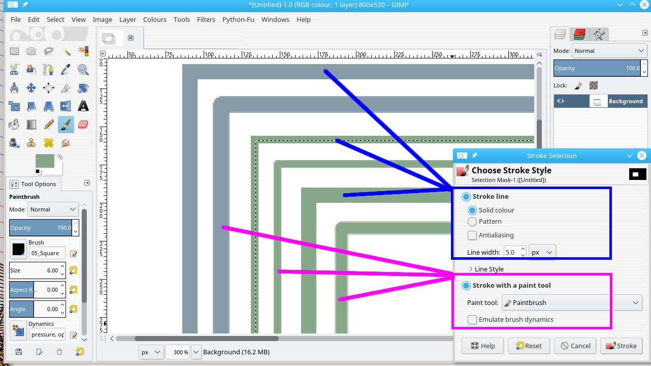 The borders were created with the Rectangle tool and then Bucket filled with colour, having expanded the pixel width of the border. I'll have a look at your comments in more detail and come back to you.