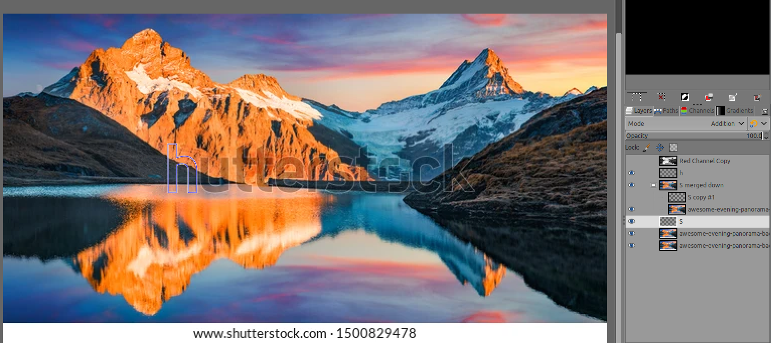 see the S disappeared (addition + edge resynth along path), see the "h" has the same lightness than the background/surrounding (did not resynth the "h", just layer in addition mode, the blue line you see is the path)