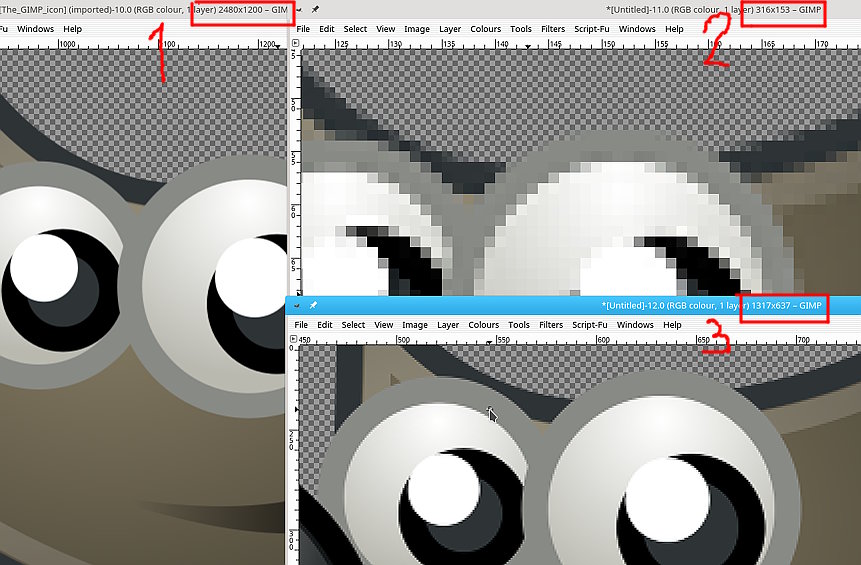 A comparison original on left, scaled images on right. Still a little stepping on (3).