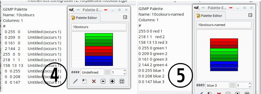 (4) is straight as Gimp generated and (5) is edited changing the order and naming the entries.