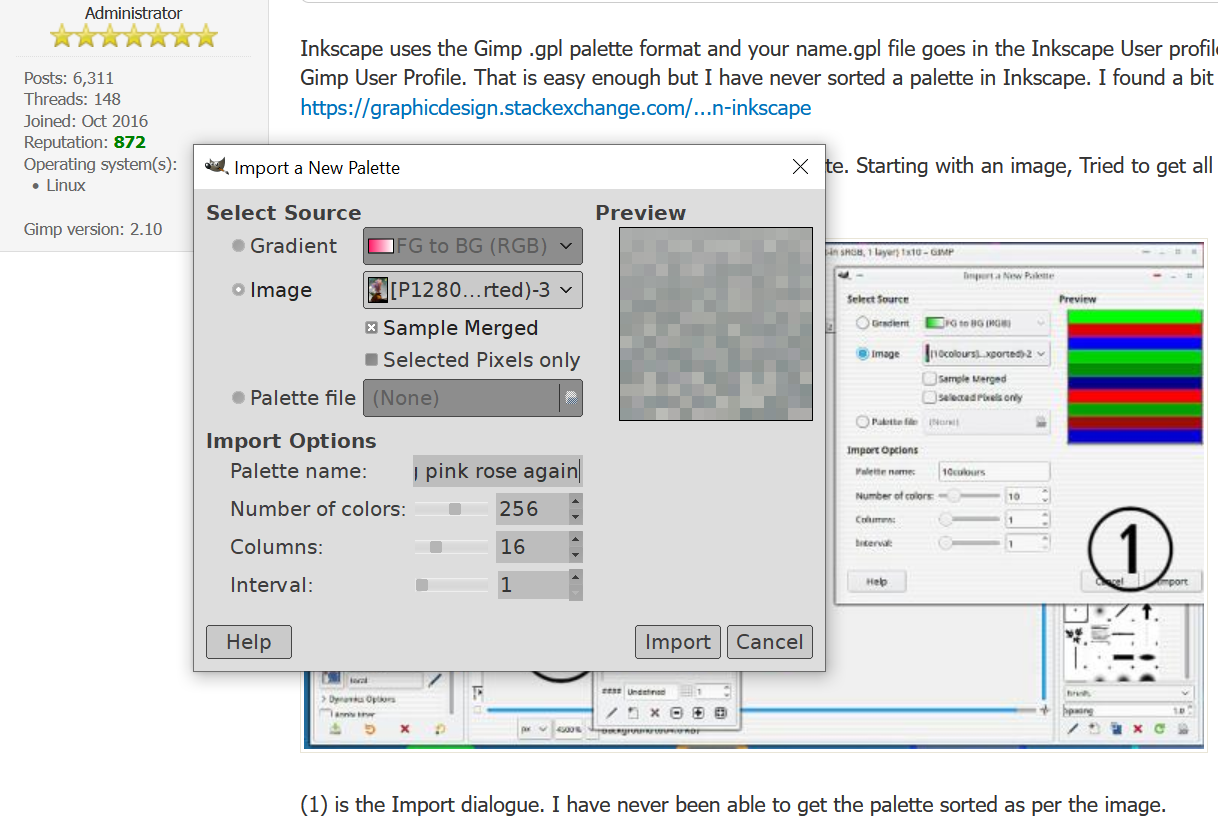 (1) is the Import dialogue. I have never been able to get the palette sorted as per the image.