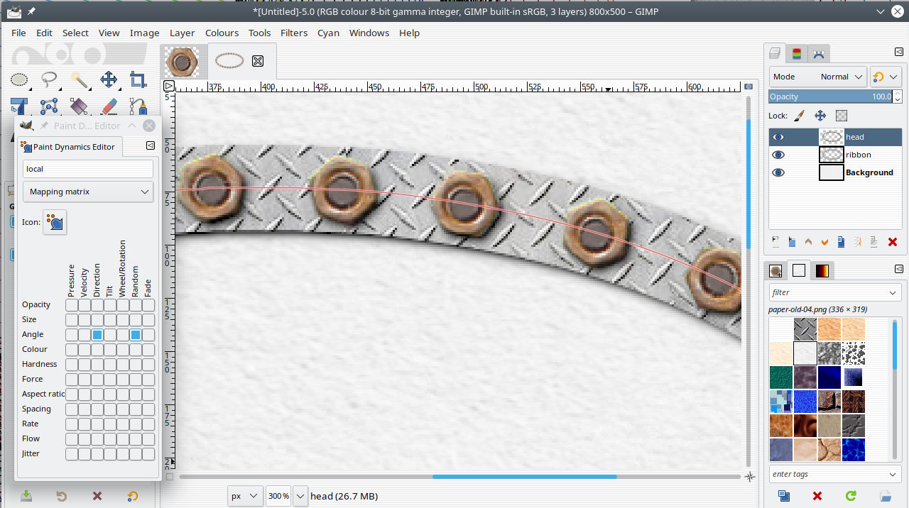 (03-25-2021, 12:48 AM)Ofnuts Wrote: Didn't see Rich's answer, but thinking among the same lines. Use a brush for the nuts, and another one for the metal under them. May I recommend the use of my ofn-brush-strokes-on-path script to have the nuts regularly spaced and evenly dividing your path. In the image below: