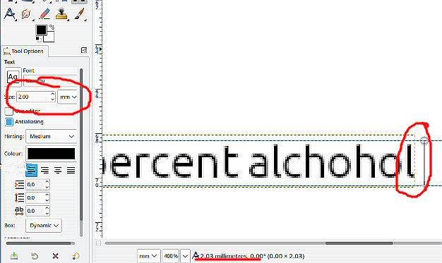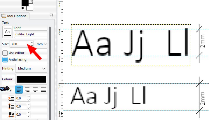 Putting in the 2 mm text is like this here. Remember the 2mm is not the height of the lowercase it is the dimensions of a rectangle specified in the font file.