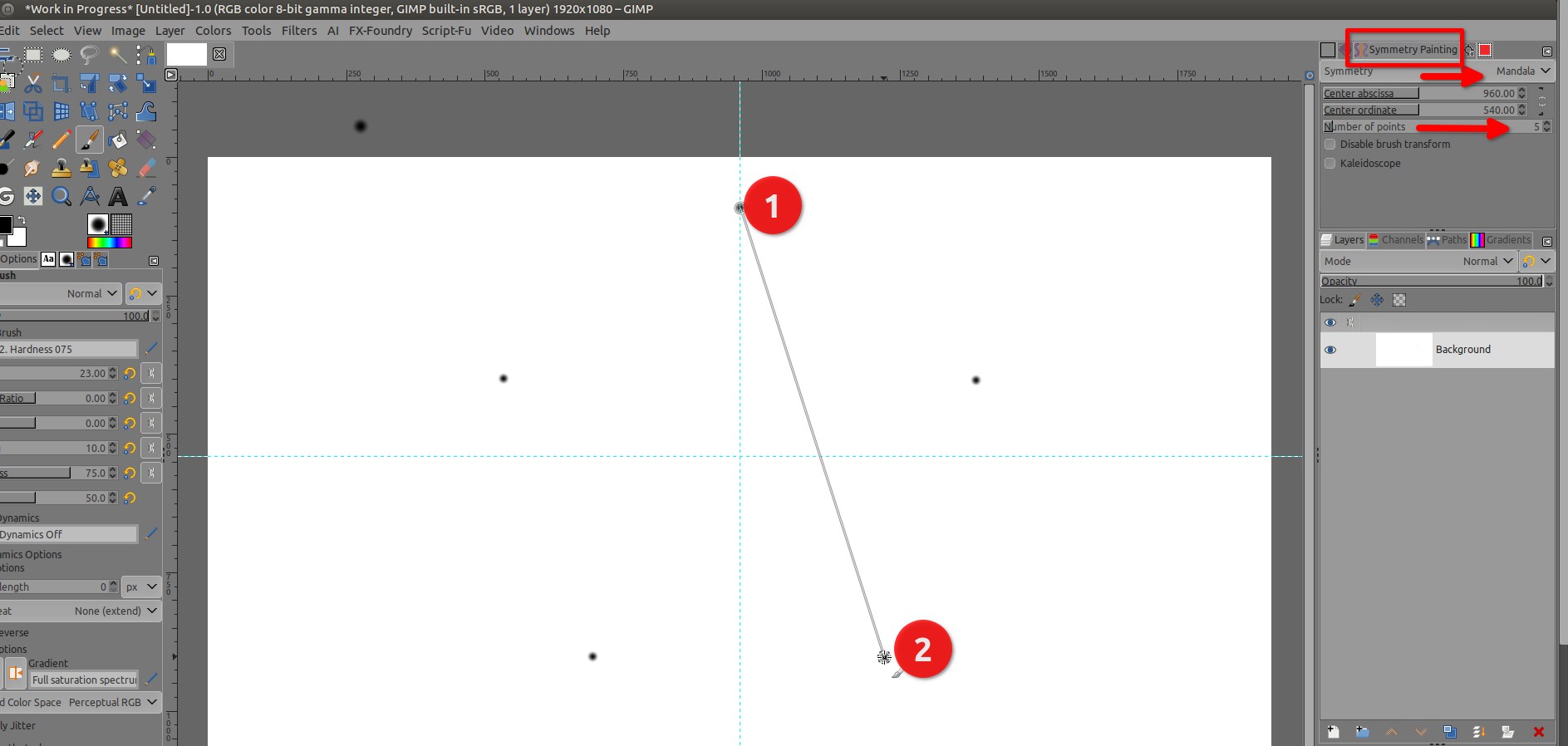 To make a star, I use the Symmetry painting tool, it's not showing up by default, thus go to Windows > Dockable Dialog > Symmetry painting, select Mandala number of point 5 (or whatever up to 100), Same as above make one dab, then hold the Shift key and dab down to the "opposite" side on the other point.