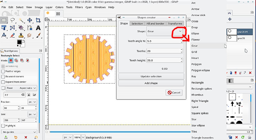 Last but not least there is that Gfig things, in Filters > Render > Gfig... which is not really user friendly (I mean no real control on the size), but it makes shapes, many kind of shapes, more about it ➤ here is the official documentation ➤ https://docs.gimp.org/en/plug-in-gfig.html