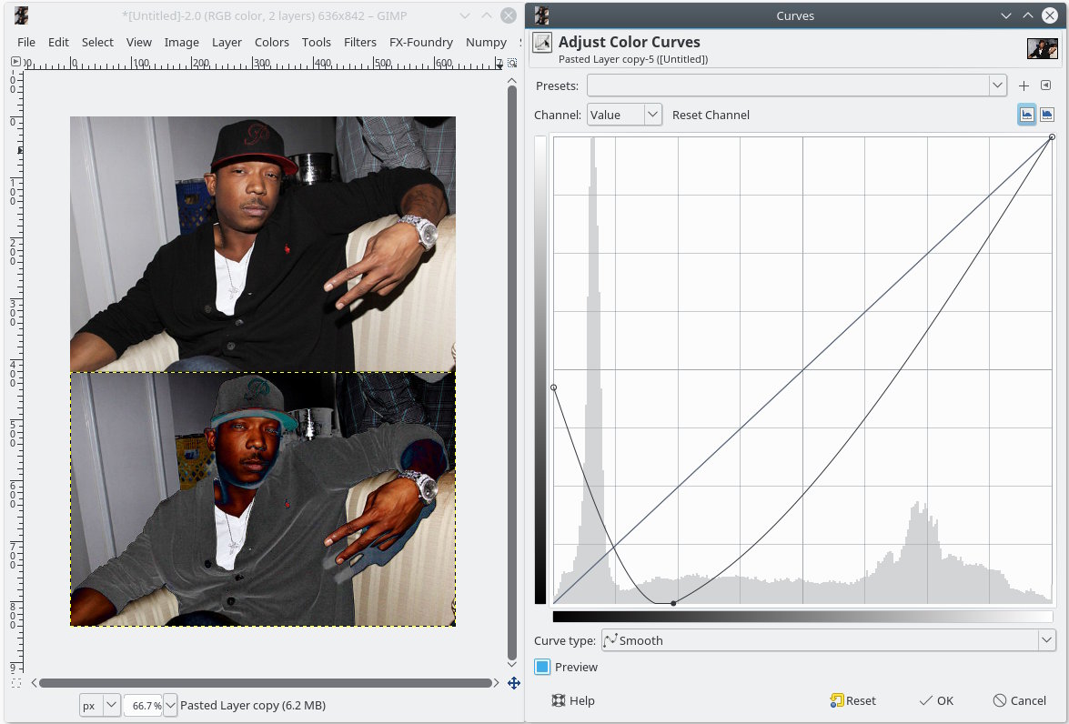 (01-07-2018, 05:05 PM)Ofnuts Wrote: "and at it's highest point turns black into something silvery" In chemical photography days, this was called "solarization". In digital photography, this is done with Curves and a negative/decreasing slope: according to this blog, the curve is pyramid shaped https://teemoran.wordpress.com/2008/11/0...with-gimp/