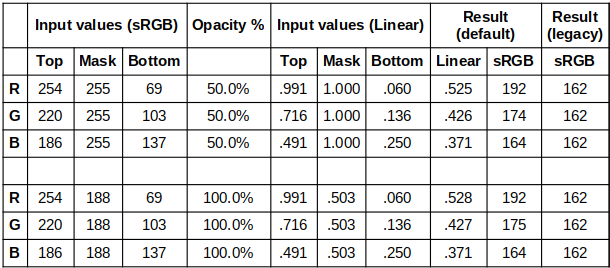 return 255*srgb(*) Browsers scale images using the sRGB values directly, so scaled images may end up darker than the original image. The three-color average example above is a good example. At native size the linear average (right square) is identical to the pattern at the top, but if the image is scaled by your browser (just zoom in/out) your browser will gamma-average the pattern at some point and make it look like the bottom left square.