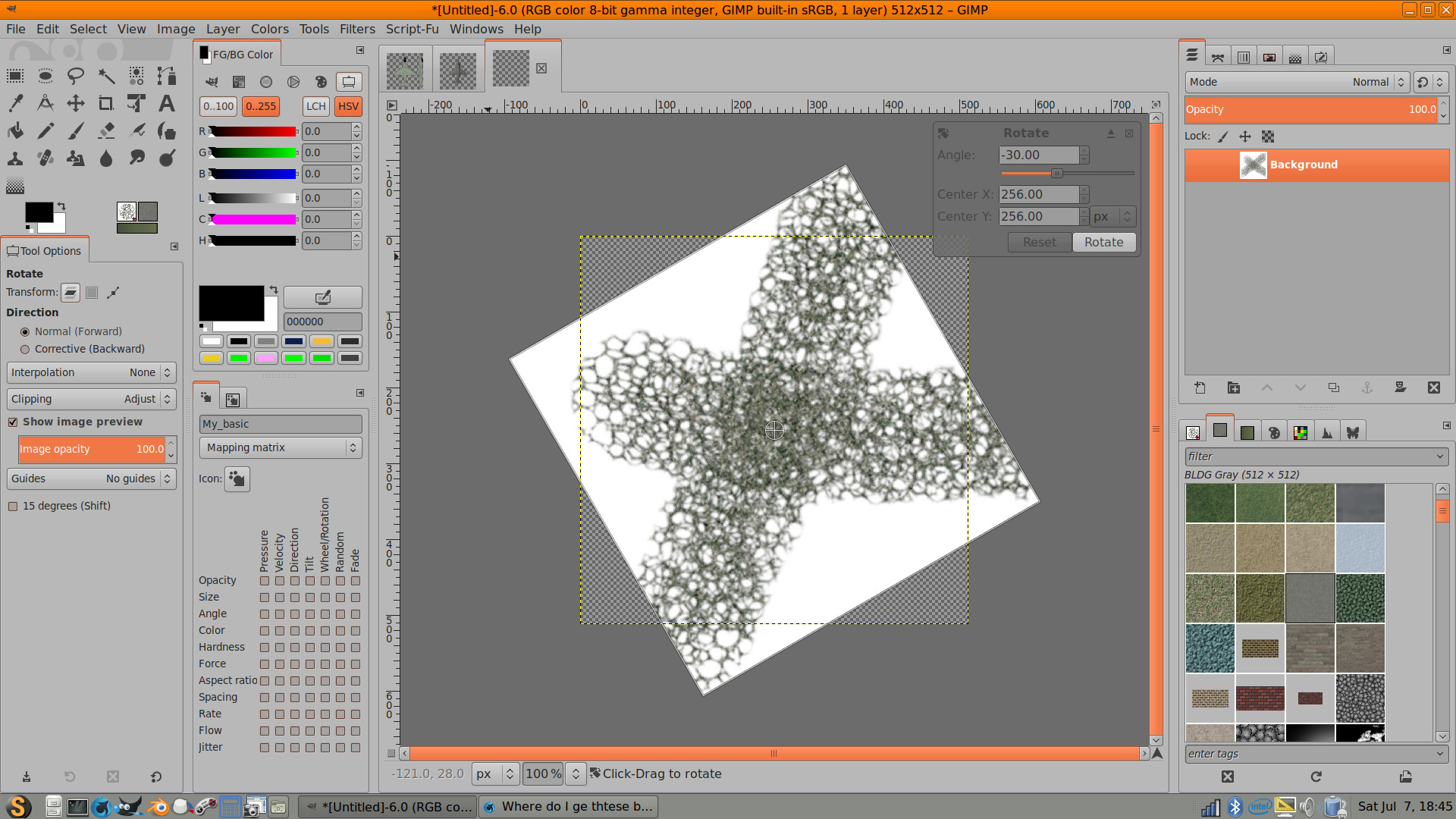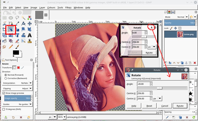 (07-08-2018, 09:00 AM)matthew007800 Wrote: Started dragging and no box appeared, Back to 2.8 then That is one option. It could be a Windows issue, it might be some settings inherited from the previous Gimp (2.4 in your profile, but I find that hard to believe). Less probable, the little info/slider window hiding behind the main Gimp window or say a dual monitor display where it is on the other screen. I think I would have tried resetting the tool options before giving up. Edit -> Preferences -> Tool Options -> Reset Tool Saved Tool Options to Default Values and Edit->Preferences->Window Management->Reset Saved Window Positions to Default Values Nothing wrong with Gimp 2.8.22, for some things can be easier to use, but none of the nice on-canvas previews for some tools. I have both installed and use each 50 % at the moment. For other new-to-gimp users, always more than one way in Gimp This is the 'legacy' type rotate (shear & scale similar) You can detach the properties box with the little upwards pointing arrow. That gives a larger floating panel, easier to move for parts of the image it might hide. There are two others in the tool box The Unified Transform Tool. Where depending on where you click and drag, rotates, scales, shears all in the same tool. The Handle Transform Tool. Again rotate, scale, shear all in the same tool. This time the user clicks to set the anchor points (handles) which determine the effect. The advantage of the new tools, for multiple operations, scale + shear + rotate, they all are performed without rendering to canvas until complete, which gives an improvement in quality. |