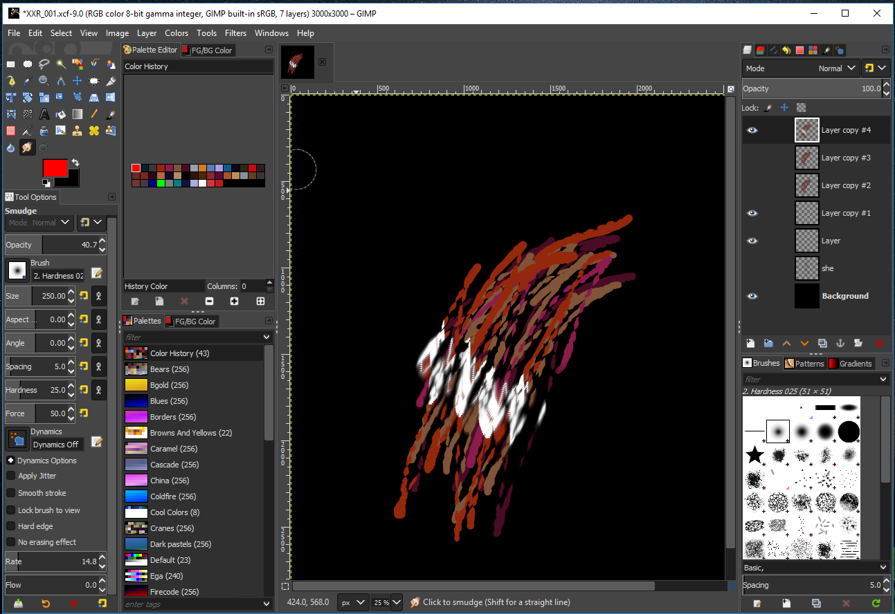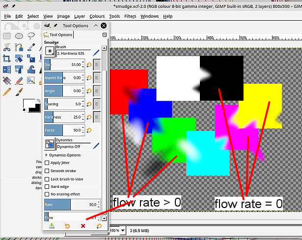 What are the smudge tool settings? Lots in Gimp 2.10 where in particular rate & flow make a big difference and bring FG colour into play.