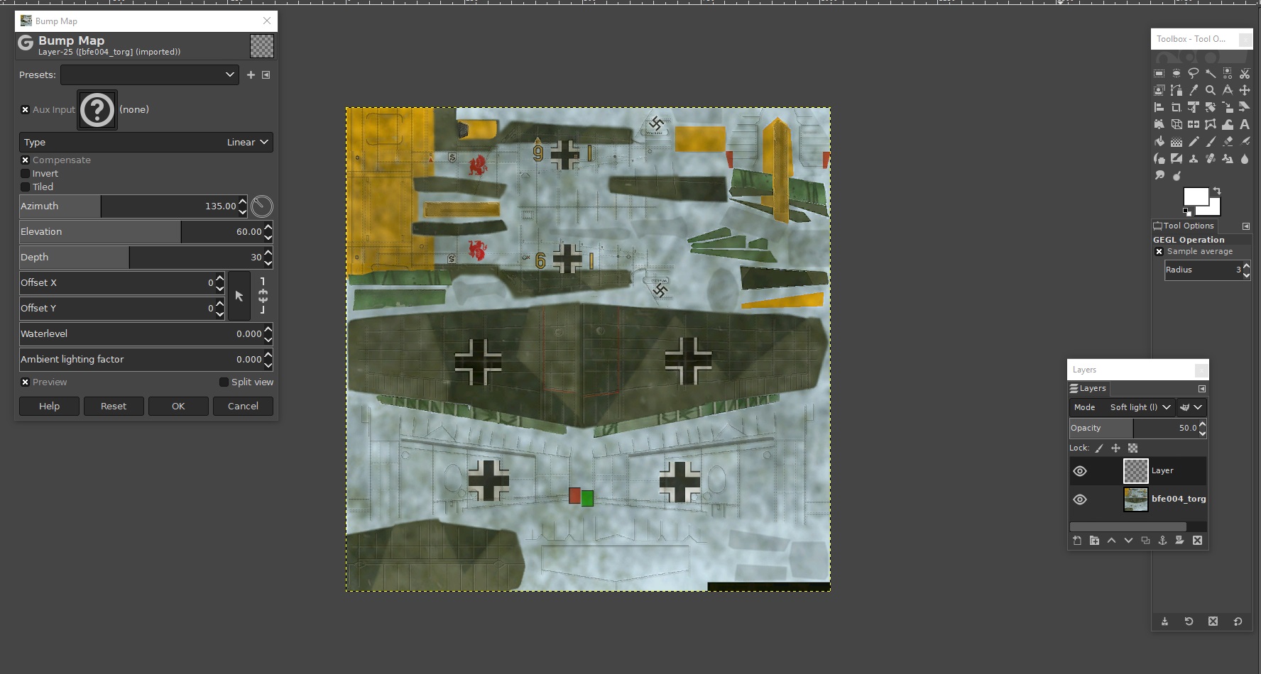 I am trying to bump map an aircraft skin which is on 2 dds files (can convert to png or whatever) which has obviously quite a few colors and occupies most of a non white/single color background. It also only has the one layer available. So far all the tutorials I have looked at including http://www.tankedup-imaging.com/gimp/bumpmap2.html haven't helped; or I am not that good at understanding!