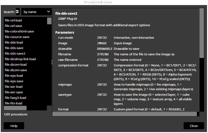 - Many calls define constants names for their arguments when necessary, better use them when they exists (alas, not for the DDS plugin, it they had existed you could have used DDS_FORMAT_RXGB_DXT5 and DDS_MIPMAPS_NONE that are a bit less mysterious than 7 and 0)