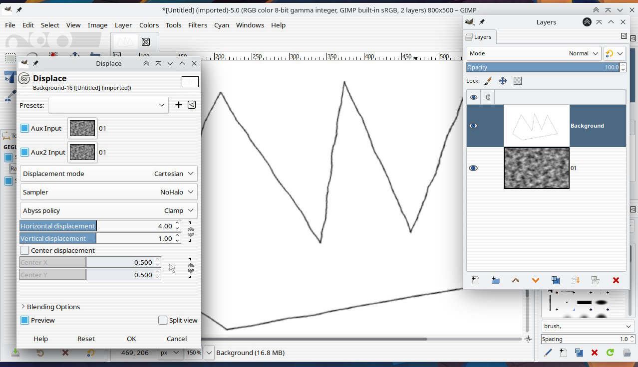 New here so just learning how to post. The previous response shows the original image (all straight lines from Sketchup image) when brought directly into Gimp. The middle image shows the ripple effect (shaky lines) in PS. Basically all the images are black and white imported into gimp, want to squiggle/jiggle them and then use them as a base layer to hand paint on top layers. Still experimenting...