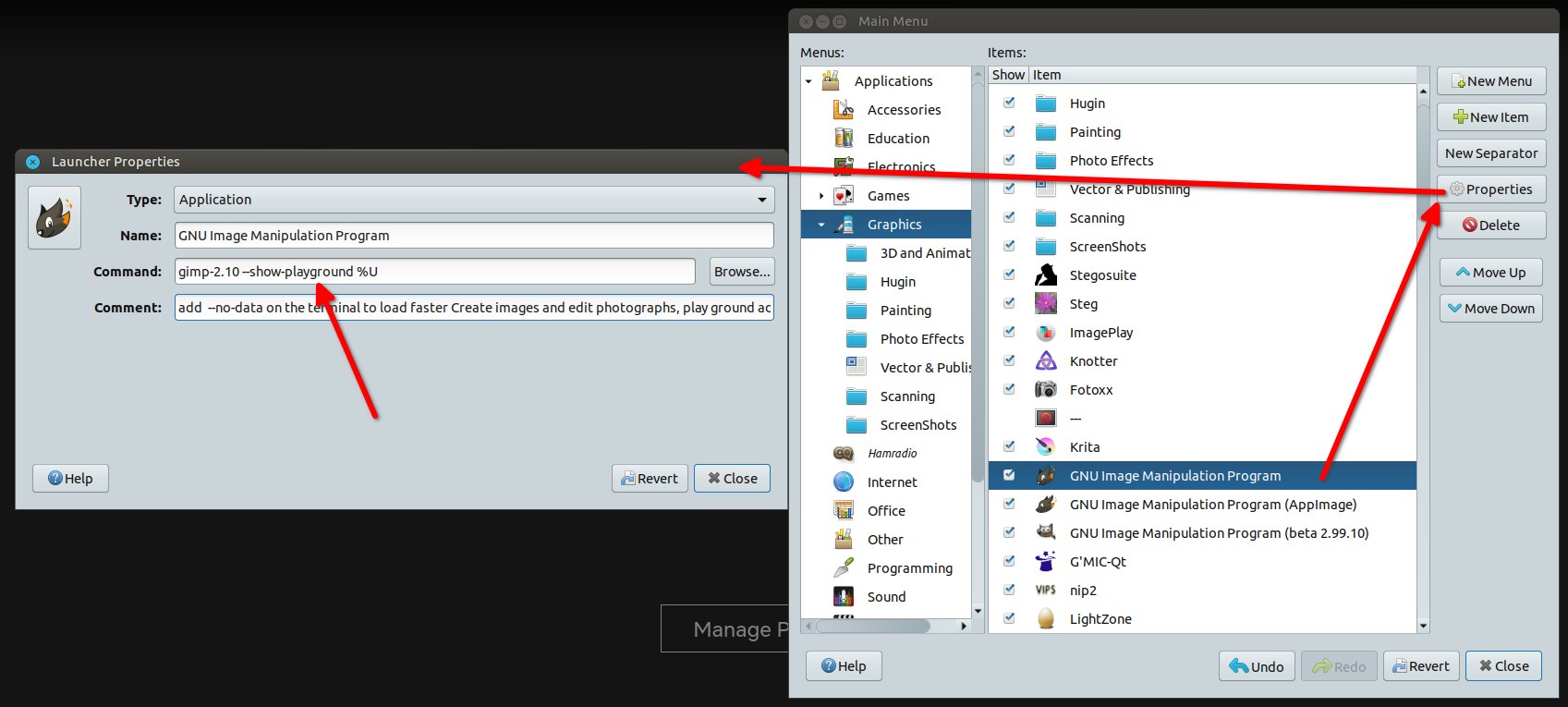 For example on Linux, I opened the menu editor