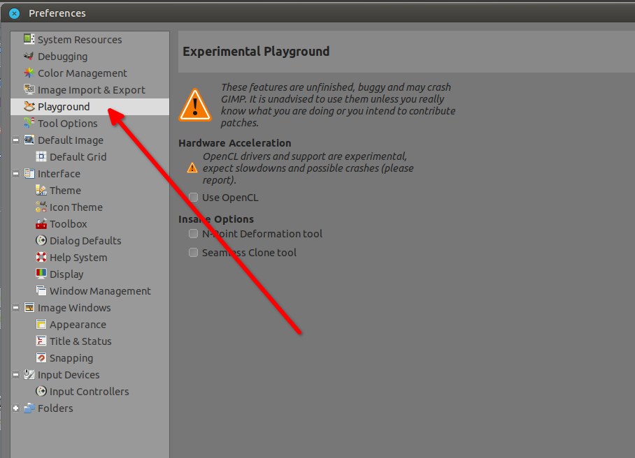 You need to add --show-playground in the command or the link > to open GIMP with the playground activated