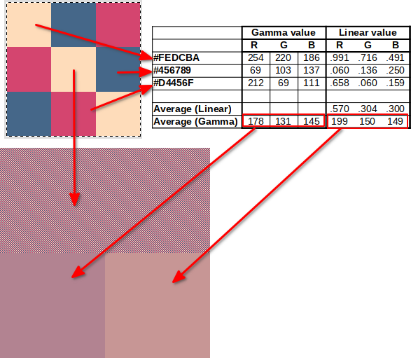 return 255*srgb(*) Browsers scale images using the sRGB values directly, so scaled images may end up darker than the original image. The three-color average example above is a good example. At native size the linear average (right square) is identical to the pattern at the top, but if the image is scaled by your browser (just zoom in/out) your browser will gamma-average the pattern at some point and make it look like the bottom left square.